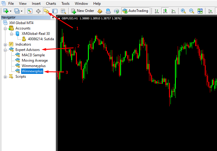 ให้มองภาพรวมของกราฟที่ D1 --> H4 — >สังเกตุแท่งเทียนกลับตัว H1 ที่บริเวณยอดที่ 2 จากนั้นใช้ EA Winmoney ในการเข้าเทรดดังนี้